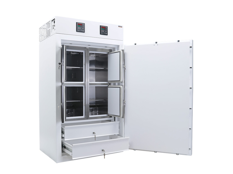 - Двумя выдвижными, индивидуально освещаемыми и запираемыми 32-ух литровыми ящиками без обеспечения тепловых режимов хранения